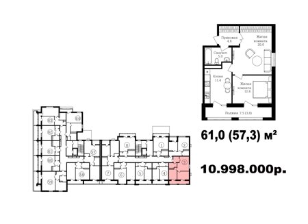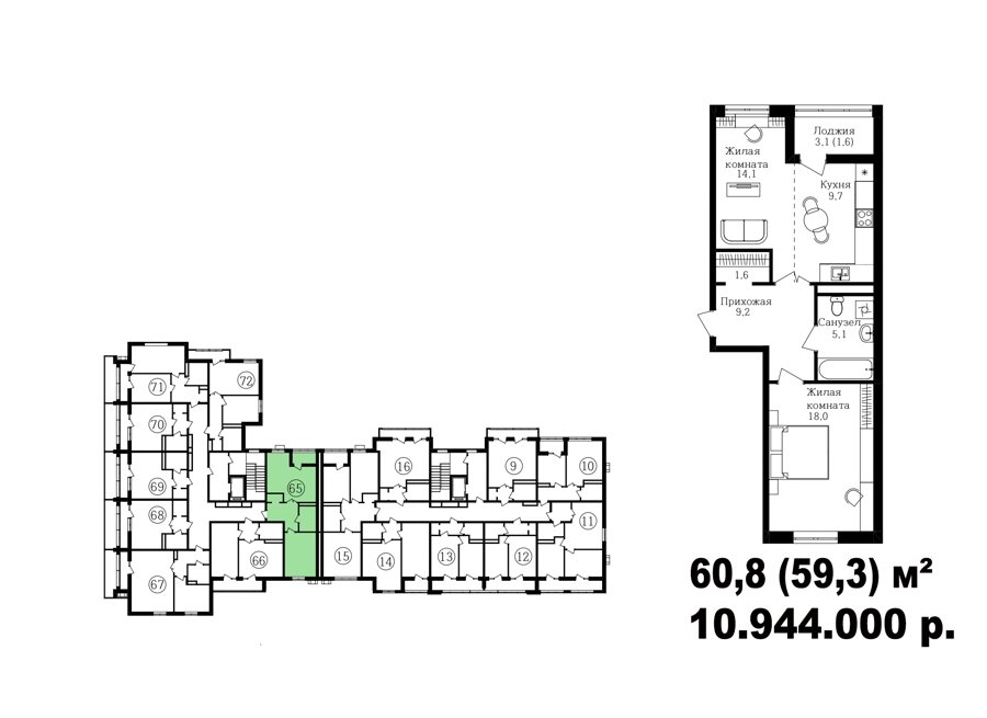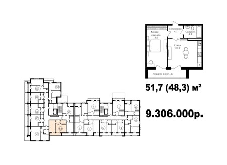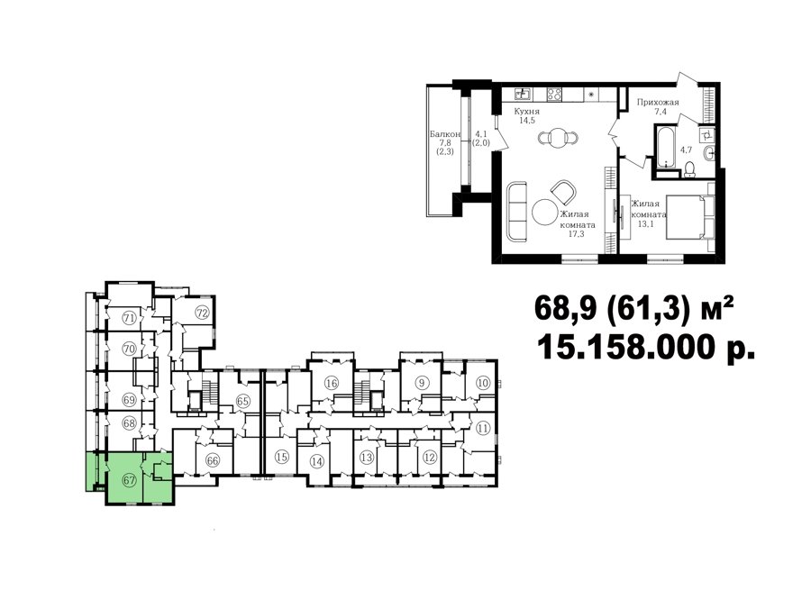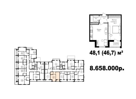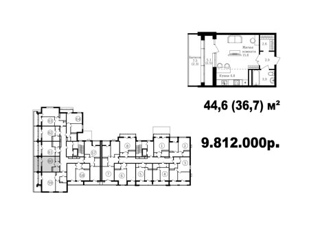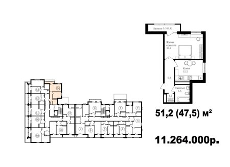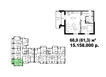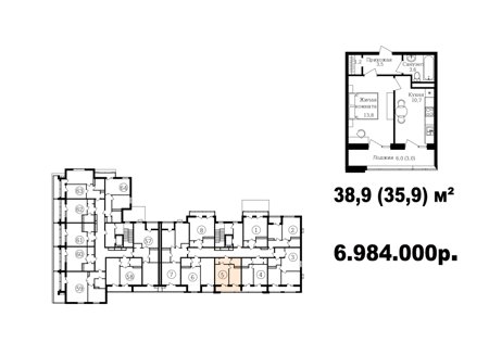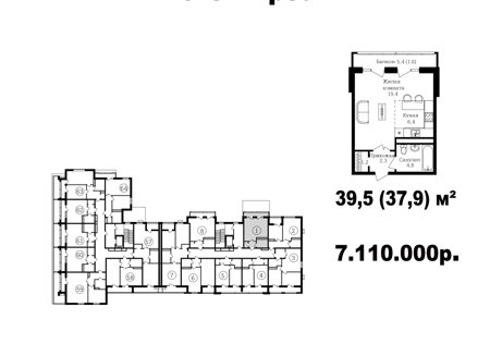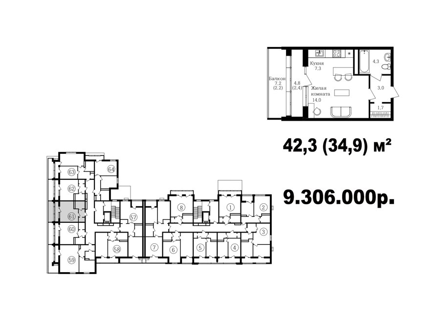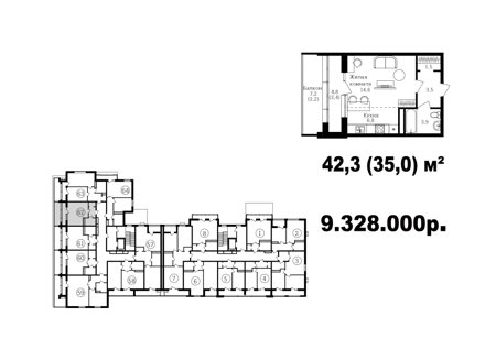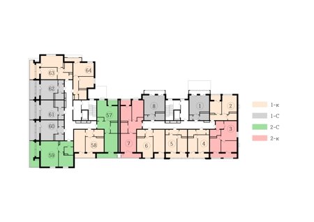 Широкий выбор студий, однокомнатных и двухкомнатных квартир от 35 м2 до 70 м2. Все квартиры имеют балкон. Серым цветом обозначены студии, желтым- однокомнатные, зеленым- евродвушки, красным- полноценные двухкомнатные квартиры.